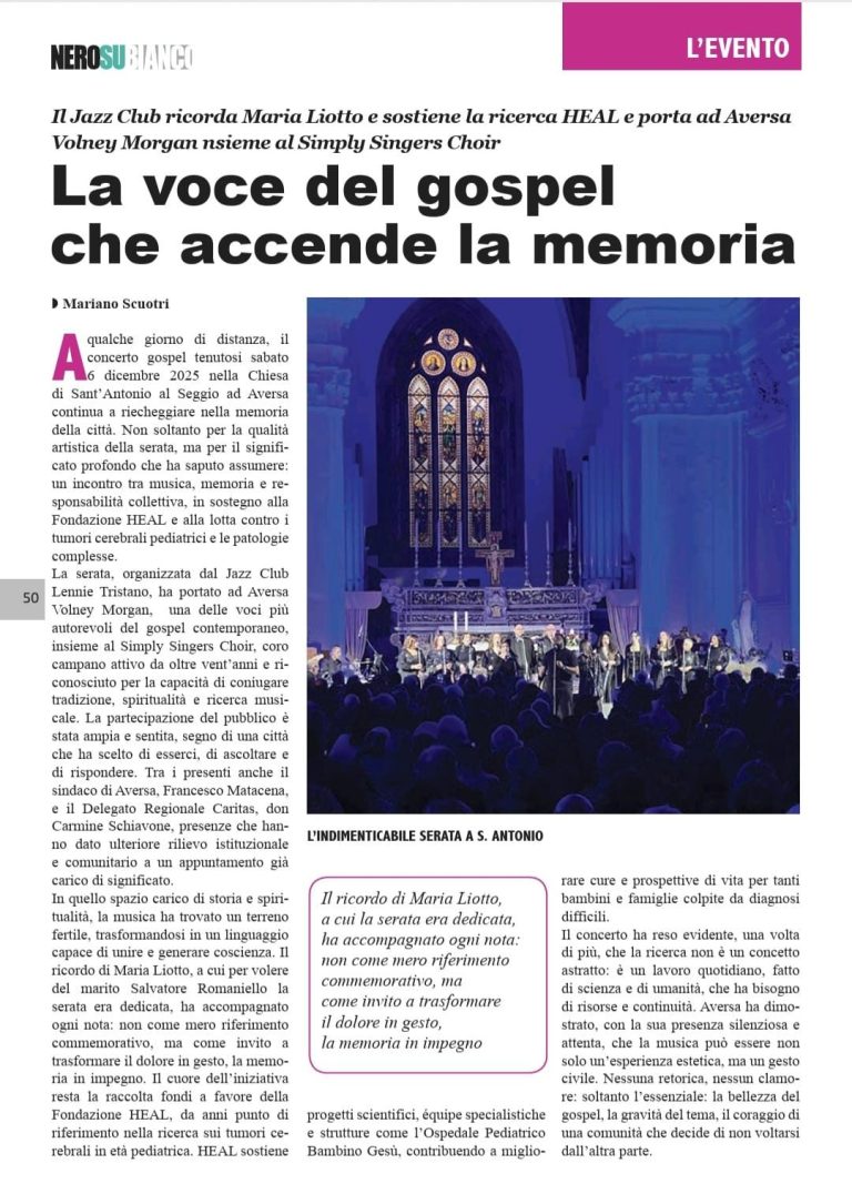 Il Club non si ferma qui ed è già tutto pronto per il prossimo concerto, nella Chiesa di S. Antonio al Seggio il 6 dicembre, dove ritorna il Simply Singers Choir con Volney Morgan e c’è da scommettere che, come lo scorso anno, sarà un altro sold out, in questo caso ancor più auspicabile attesa la finalità di beneficenza della serata per raccogliere fondi per la ricerca sui tumori.